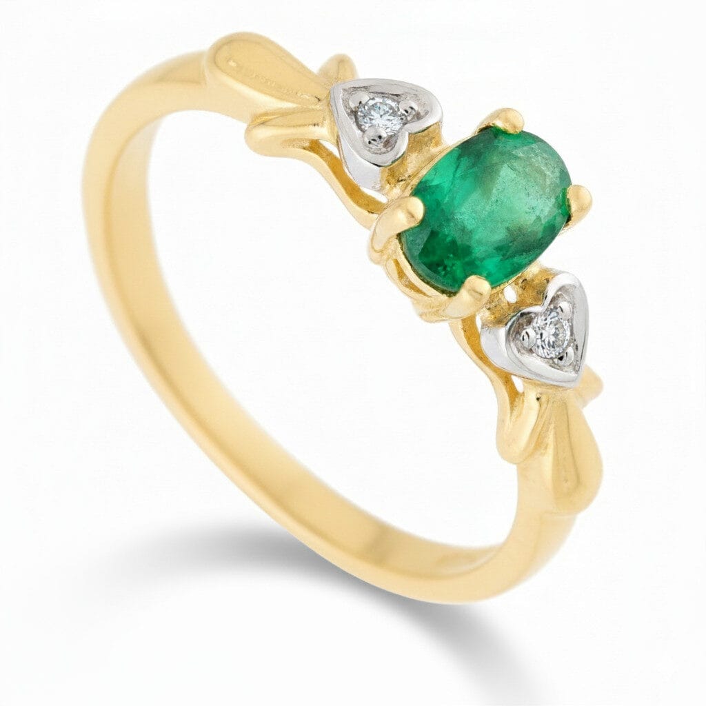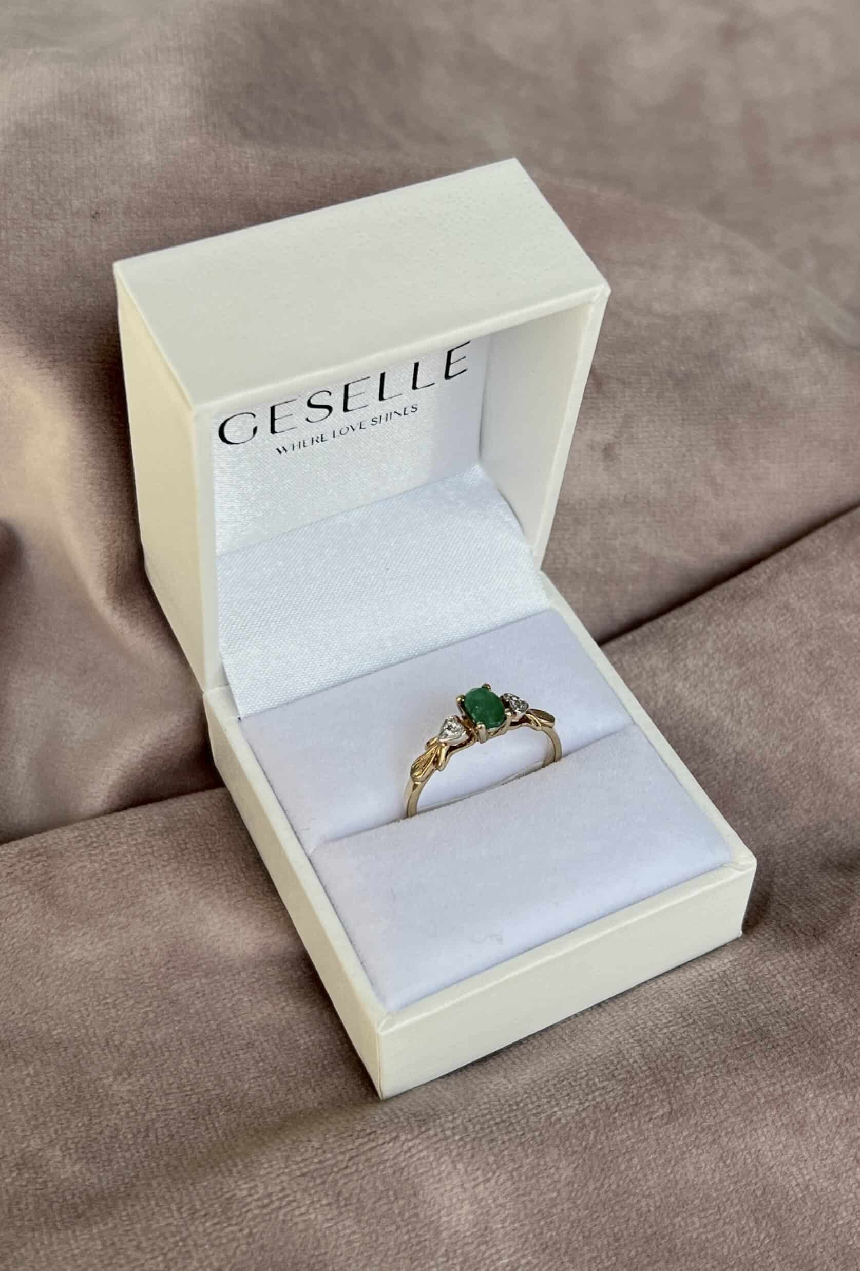 Pierścionek zaręczynowy Serenity z żółtego złota w stylu retro z owalnym szmaragdem GESELLE jest eleganckim dziełem jubilerskim, który przyciąga wzrok swoim unikalnym designem. Centralnym elementem pierścionka jest owalny szmaragd naturalny, który olśniewa swoim blaskiem i głębią barwy. Kamień jest starannie osadzony w finezyjnej oprawie, która podkreśla jego naturalne piękno.