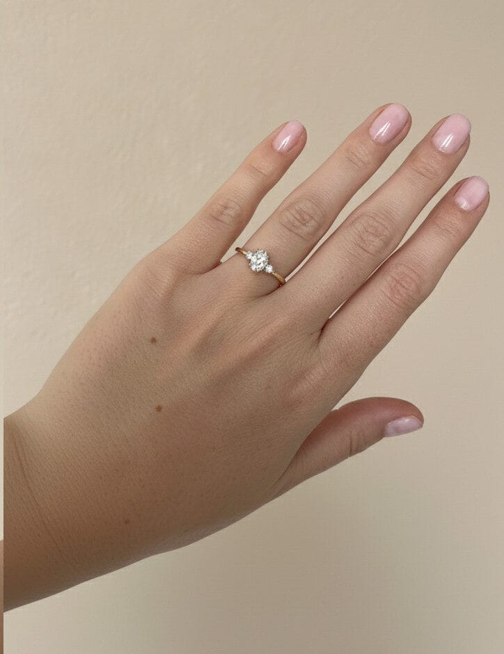 Każdy pierścionek zaręczynowy Taylor jest wytwarzany metodą rzemieślniczą przez naszego Mistrza Złotnictwa. Proces ten różni się od produkcji masowej przede wszystkim indywidualnym podejściem do oprawy kamieni. W przypadku trzech diamentów o różnych szlifach (owalny i okrągły), niezwykle ważne jest precyzyjne dopasowanie wysokości ich osadzenia, aby tworzyły spójną, harmonijną płaszczyznę.