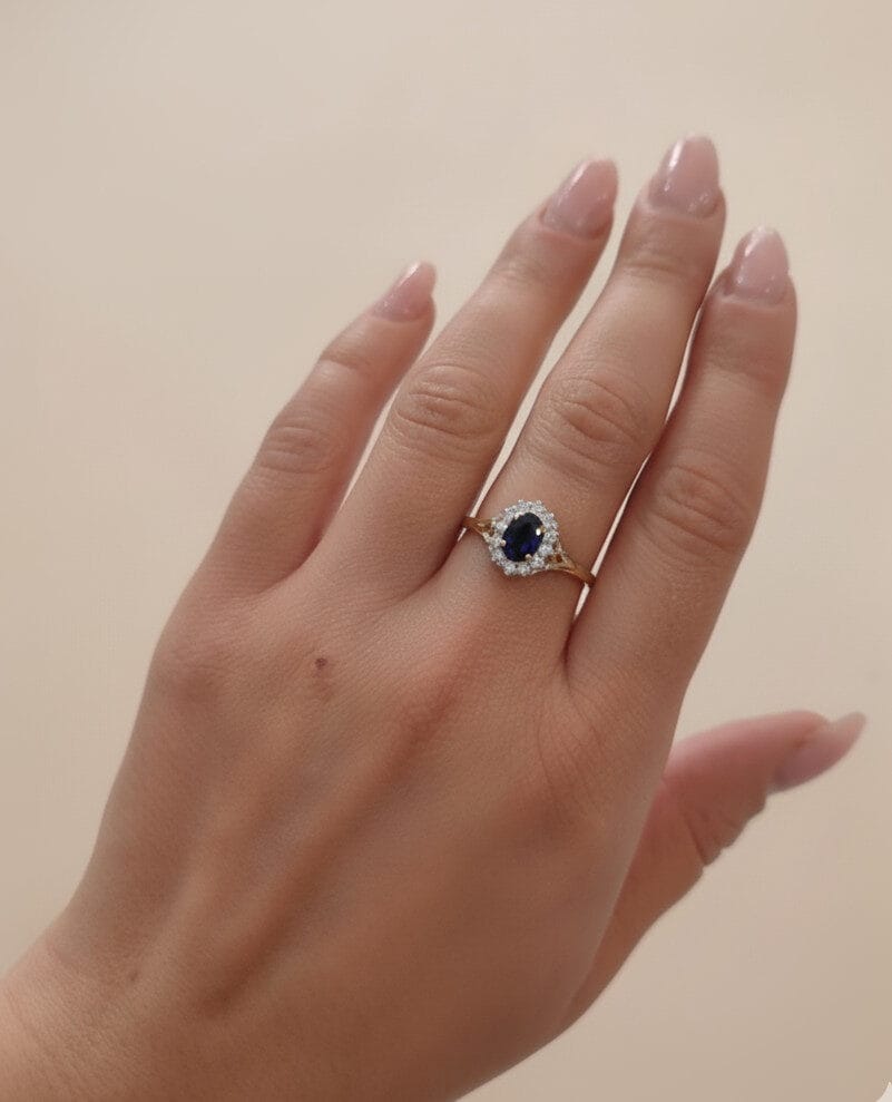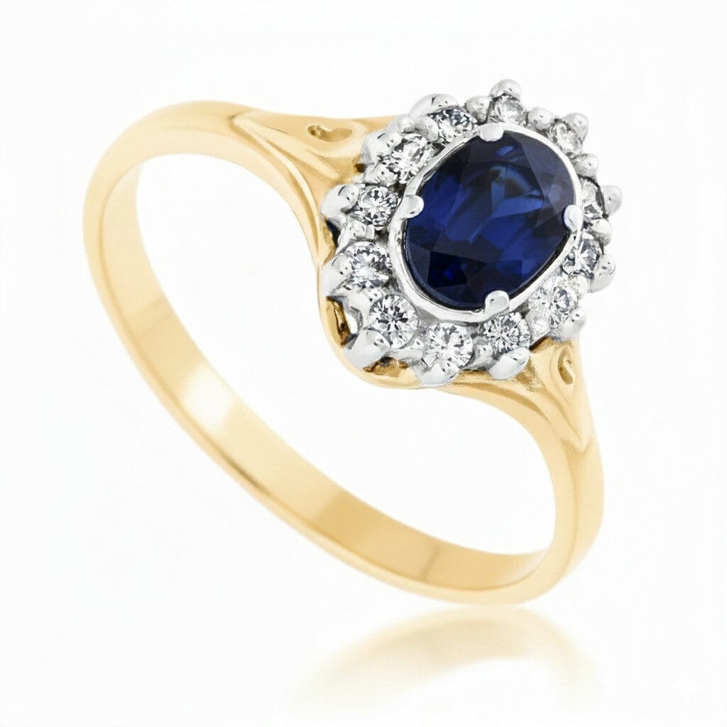 Centralnym punktem, który zdobi ten pierścionek zaręczynowy, jest naturalny szafir o owalnym szlifie i głębokiej, intensywnej barwie. Wybór tego kamienia to świadoma decyzja o rezygnacji z przewidywalnej klasyki na rzecz biżuterii o unikatowym charakterze. Szafir, ceniony za swoją twardość i dostojny blask, idealnie koresponduje z ciepłym odcieniem żółtego złota próby 585. Dla kogoś, kto ceni design i merytoryczne podejście do detali, ten model jest dowodem na to, że luksus tkwi w precyzyjnym doborze barw i szlachetnych materiałów.