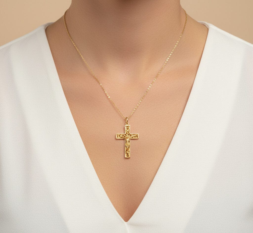 Krzyż wyróżnia się delikatnymi ażurowymi zdobieniami, które nadają mu lekkości i finezji. Te subtelne wzory przypominają misternie wyplecioną tkaninę, której prześwity potęgują wrażenie delikatności, a zarazem podkreślają głębię symboliki. Ażurowe detale sprawiają, że biżuteria zyskuje nowoczesny i unikalny charakter, jednocześnie nie tracąc swojej klasycznej formy.
